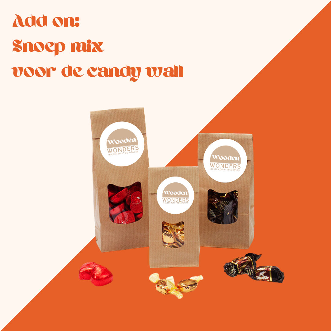 Maak je Candy Wall compleet door direct bij Wooden Wonders zakjes snoep te bestellen. Wij bieden een kleurrijke selectie van schepsnoep aan die we samen met de Candy Wall bij je leveren, zodat je deze meteen kunt vullen. Snel, gemakkelijk én feestelijk!